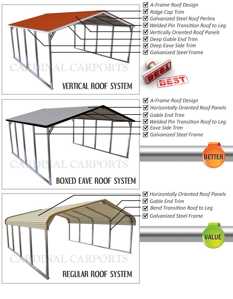 The next step in selecting your carport are choosing unit roof system. We have three types of roof systems and they are defined and illustrated below. Using our Roof System Guide, you will have all of the information that you need to make the choice that's best for your needs and for your budget.